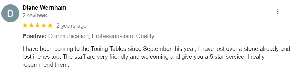 "I have lost 8lbs, 12 inches and 1 jeans size. I am feeling great and love my toning table sessions."